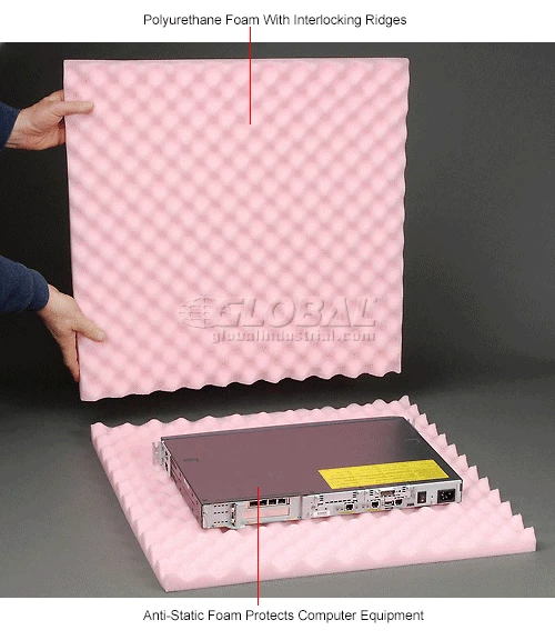 This antistatic foam set is made of thick convoluted polyurethane foam to the size you need. The total set height is 2″. The set is 2 sheets of interlocking foam.