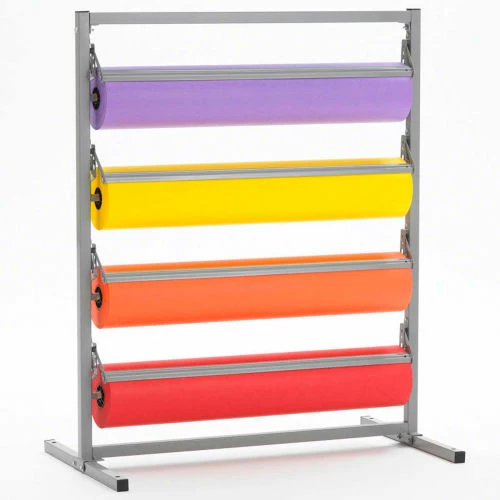 This four deck tower is ideal for use on work floor. It holds up to 9″ diameter rolls in various widths, weights and thicknesses. The hub adapters and metal dowels are available if using various widths of paper on one rack. Optional serrated blades are also available (T344R). It is finished in durable gray baked powder coat. The tower is easily assembled and ships k.d via UPS.