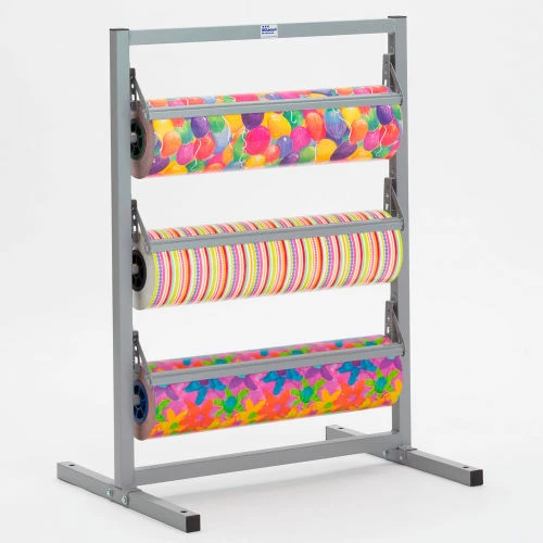 This three deck tower is ideal for countertop use or on work floor. It holds up to 9″ diameter rolls in various widths, weights and thicknesses. The hub adapters and metal dowels are available if using various widths of paper on one rack. There are optional heavy duty casters available (2 of which can lock). Optional serrated blades are also available (T343R). It is finished in durable gray baked powder coat. The tower is easily assembled and ships k.d via UPS.