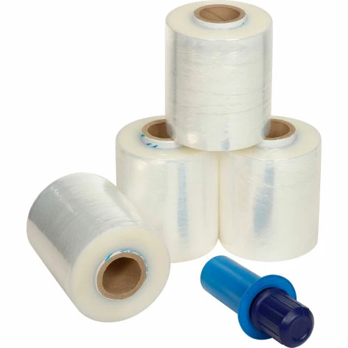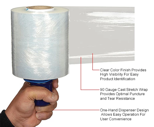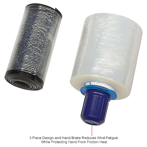 These stretch wraps have one hand dispenser with an ergonomic 3 piece core design and hand brake. The hand brake protects the operator’s hand from friction heat. The ergonomic 3 piece design under the hand brake reduces wrist fatigue, which can cause carpal tunnel syndrome. These wraps are sold as 4 rolls per case.