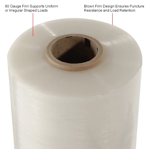 The stretch wrap film holds materials together safely while protecting them from dirt, moisture, theft and damage. This high cling blown film has excellent puncture and load retention to protect and secure loads during shipment. Note: 80 Ga film is recommended for uniform to irregular shaped loads (2000 to 3000 lbs).