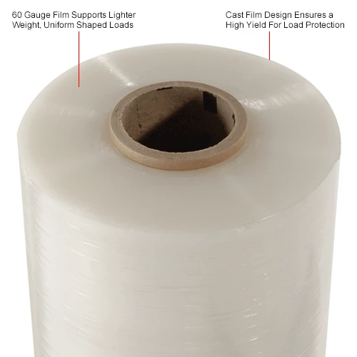 The stretch wrap film holds materials together safely while protecting them from dirt, moisture, theft, and damage. This high clarity cast film has a quiet release and high yield for outstanding load protection. It offers excellent value without compromising quality. Note: 60 Ga film is recommended for uniform shaped, lighter loads (under 2000 lbs).