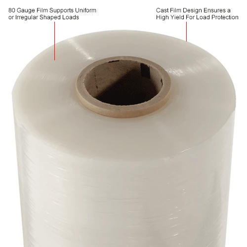 The stretch wrap film holds materials together safely while protecting them from dirt, moisture, theft and damage. This high clarity cast film has a quiet release and high yield for outstanding load protection. It offers excellent value without compromising quality. Note: 80 Ga film is recommended for uniform to irregular shaped loads (2000 to 3000 lbs).